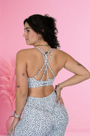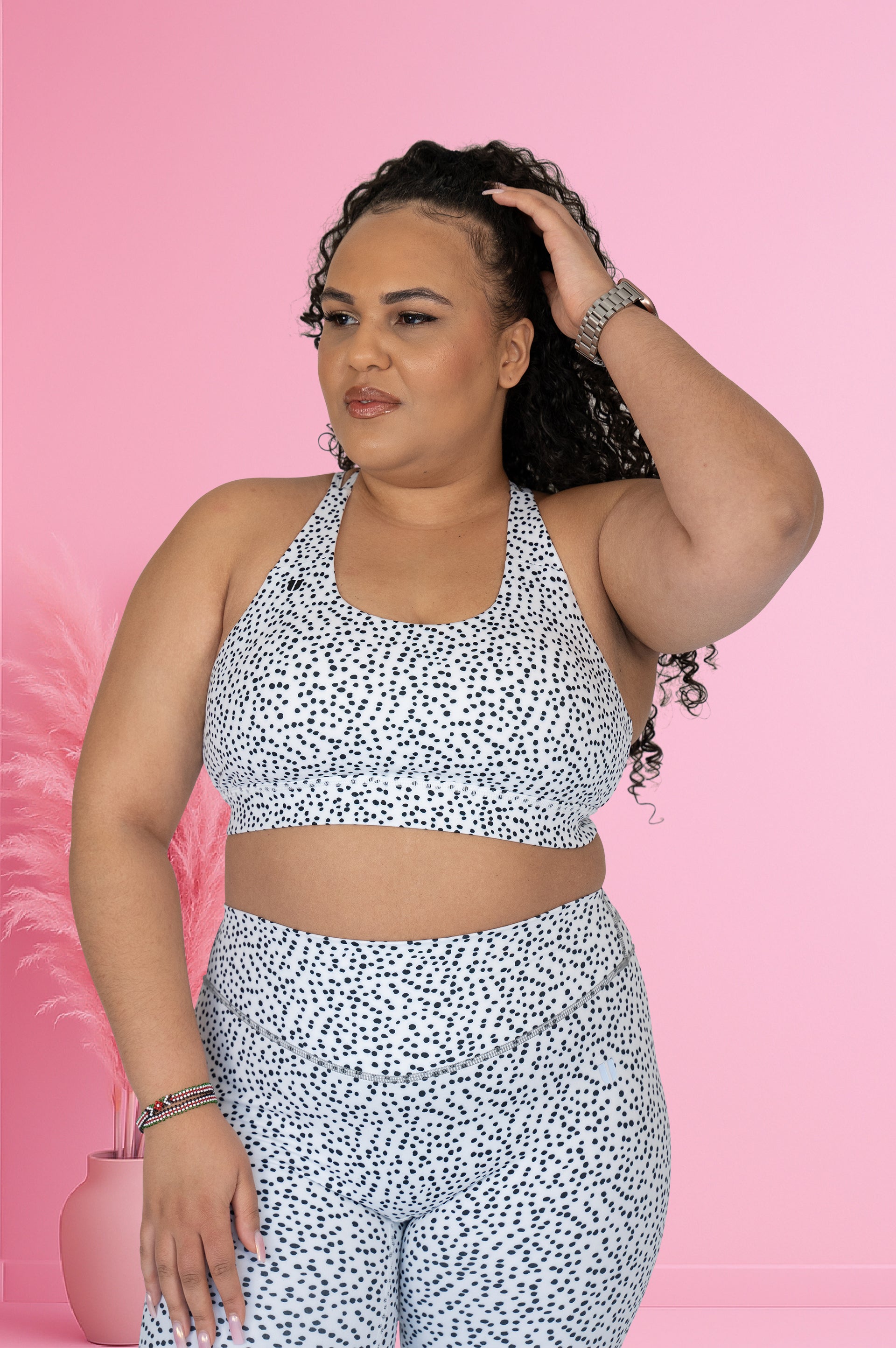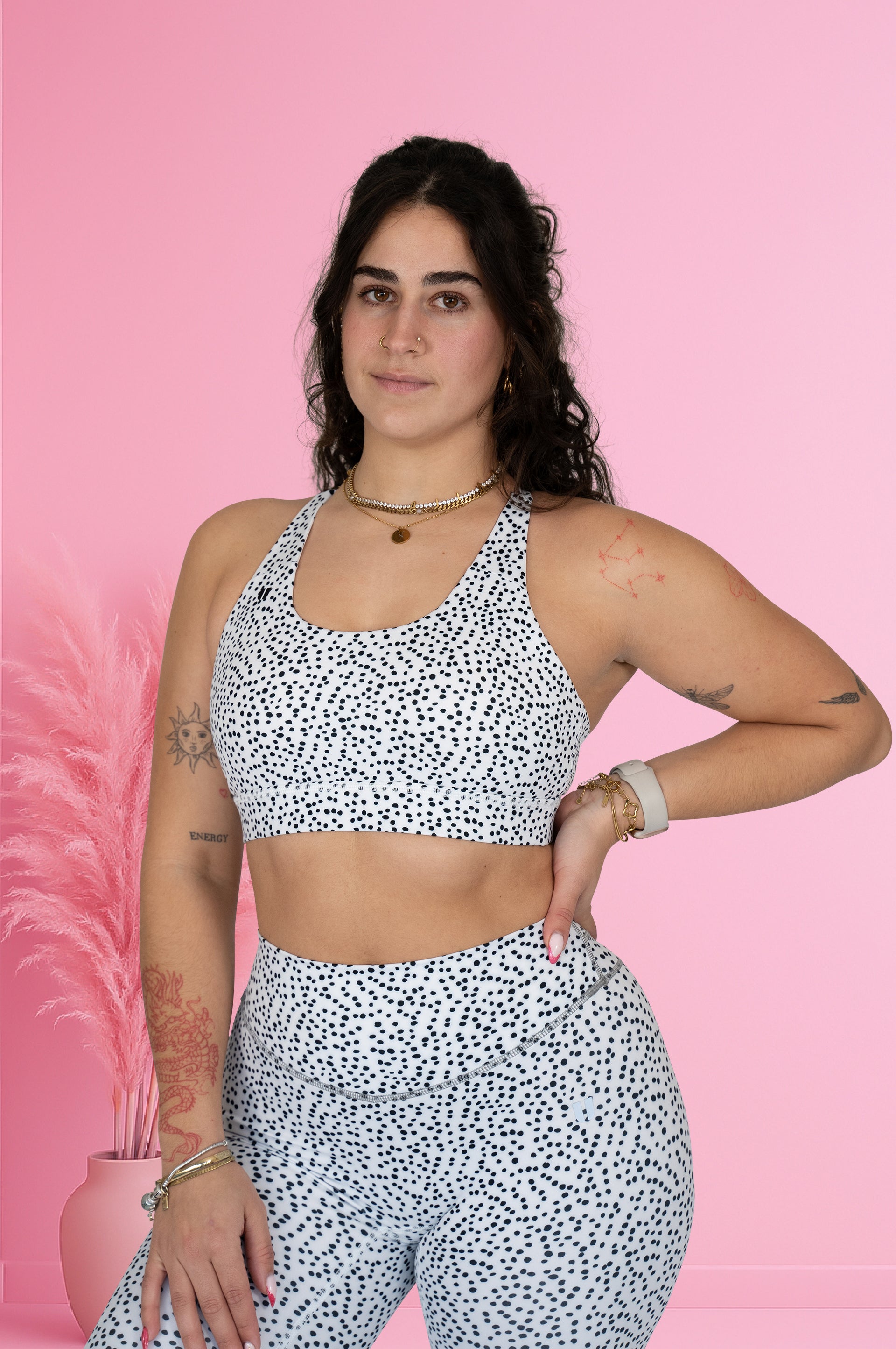 Get ready to conquer your workouts in fashion and function with our brushed pattern support sports bra. Made from a comfy and flexible material, it offers both comfort and support while highlighting your shape. With a higher U-neck design, it flatters most chest sizes, while the strappy racerback adds extra support. And don't miss the black dotted print on white fabric, for the real girly pops. The perfect blend of fashion and function, our high support sports bra comes with removable pads.