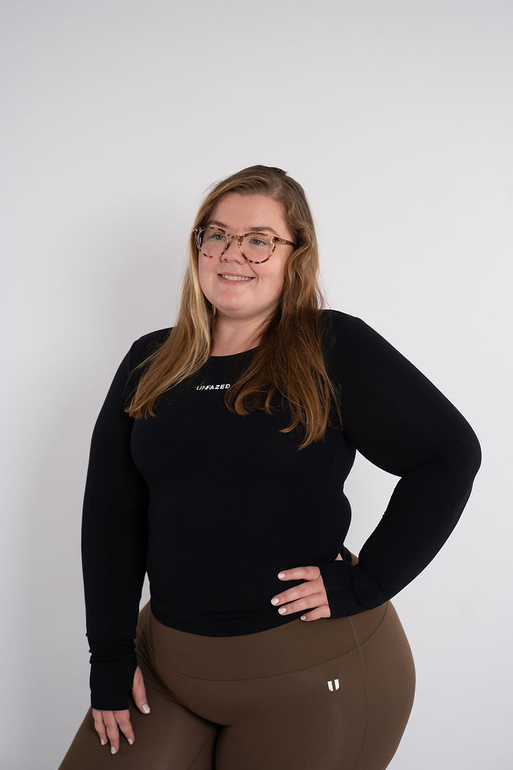 Leen (longs cheveux blonds) porte une taille large. 170 cm, 85B, porte une taille réelle 40/42 en haut en vêtements normaux.