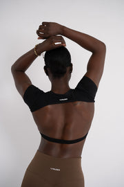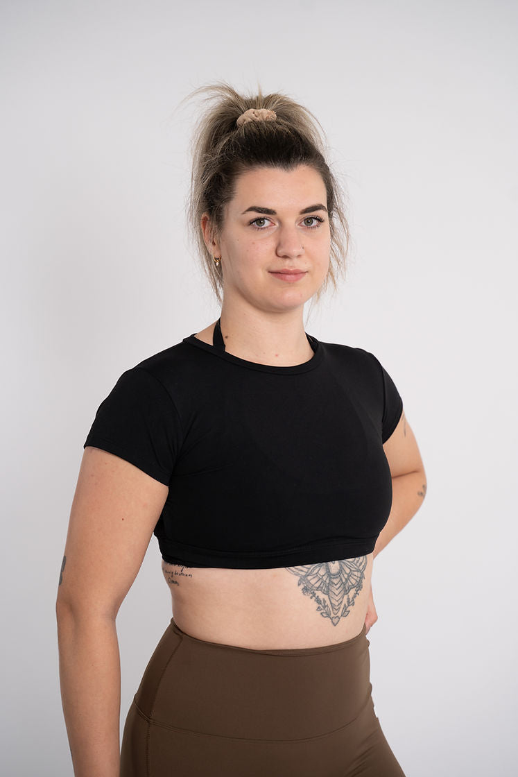 Binta (zwarte knot) draagt ​​maat M in dit topje. Ze draagt ​​pads eronder. 170cm, 60kg, 80A.
